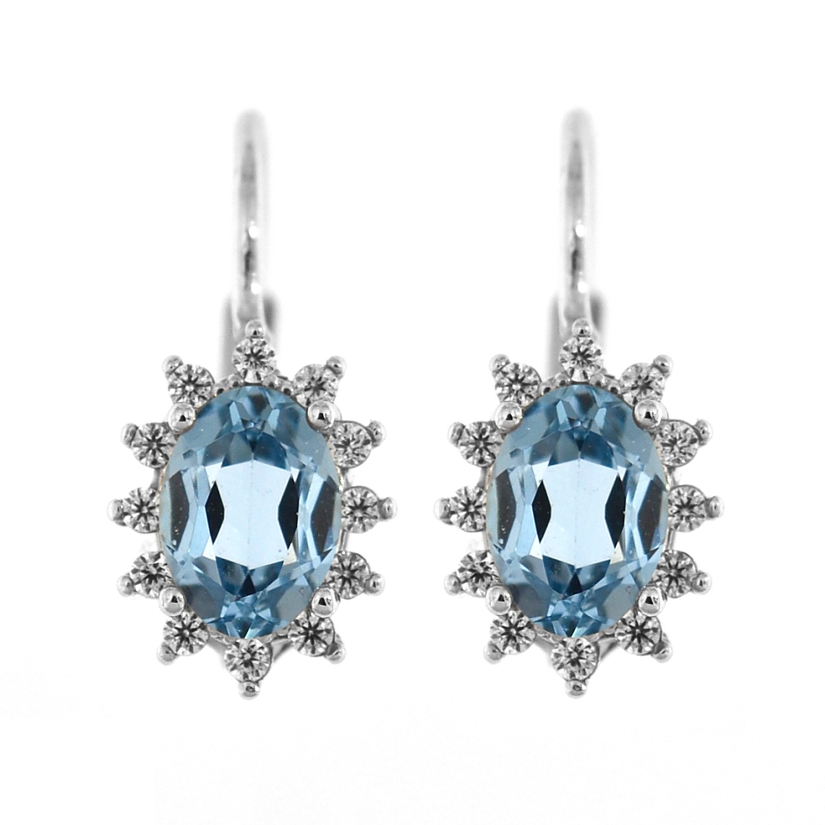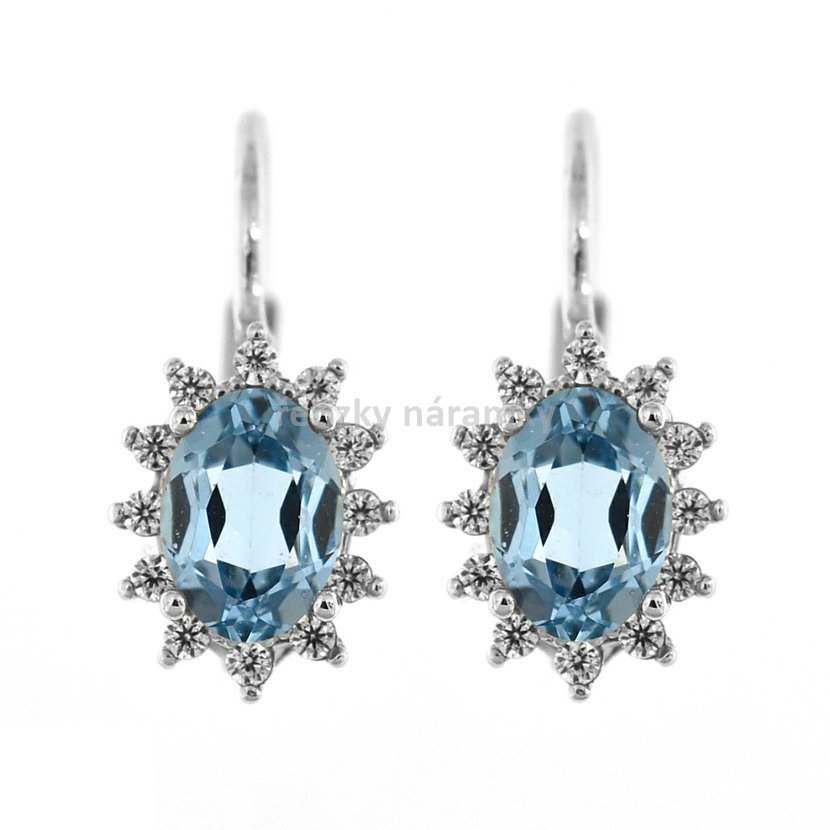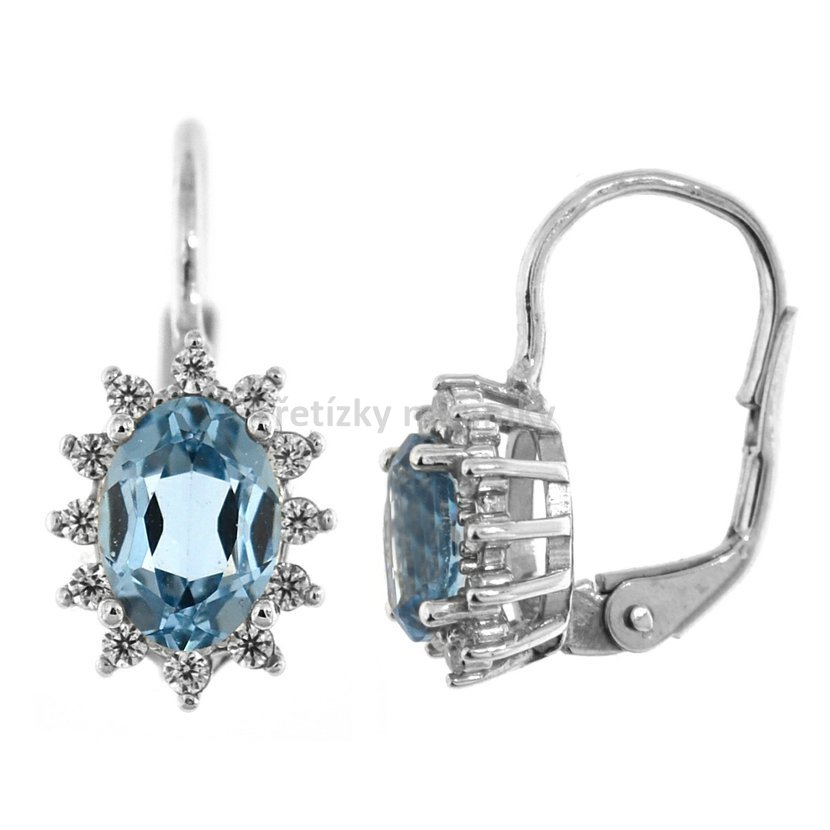 Náušnice ze stříbra se zapínáním na patent mají centrální oválný zirkon modré barvy a kolem něj jsou dozdobené menšími bílými zirkony.