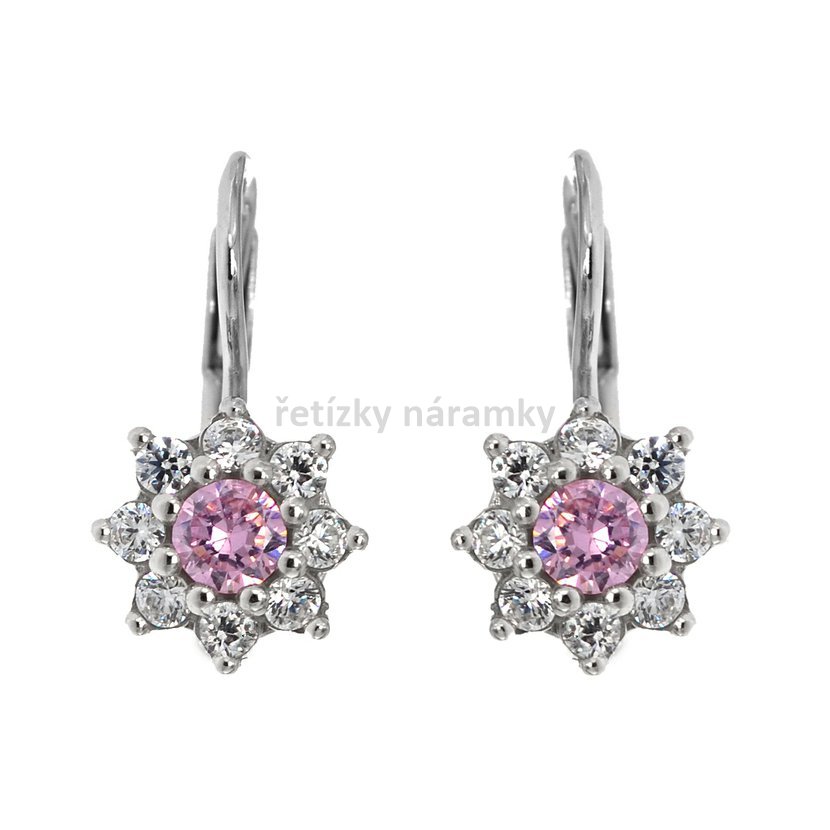 Náušnice ze stříbra ve tvaru kytiček, kombinace čirých zirkonů a růžového ve středu, mají zapínání na patent.